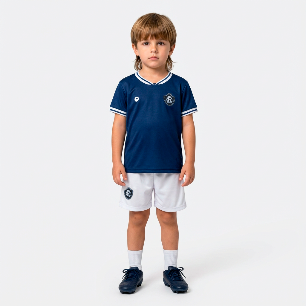 O Conjunto Infantil Estilo II traz a combinação clássica e elegante do Clube do Remo: camisa azul-marinho com detalhes em branco e short branco com o escudo oficial.