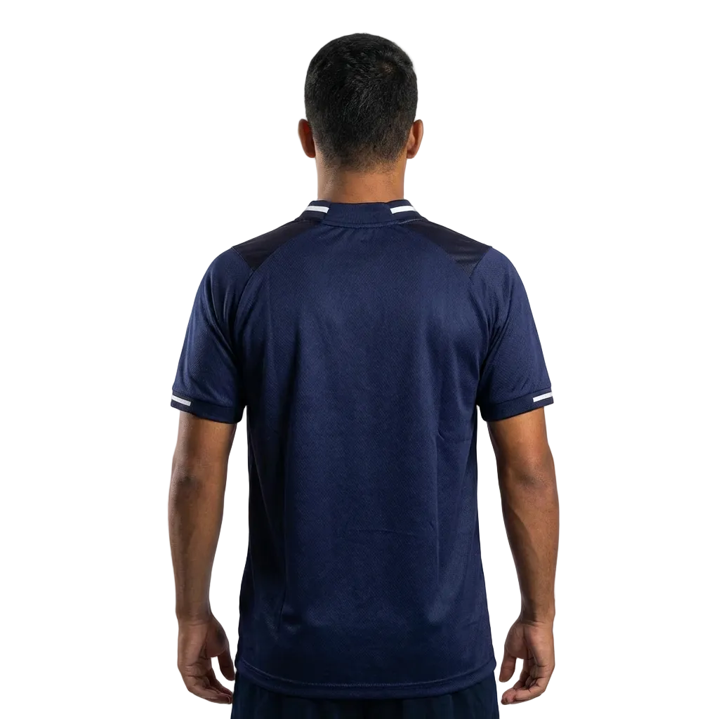 A peça conta com gola em “V” reforçada e filetes cinza nos punhos e na gola, oferecendo um toque de classe ao design. O tecido leve e respirável garante conforto durante todo o dia, ideal tanto para uso casual quanto para treinos ou práticas esportivas.