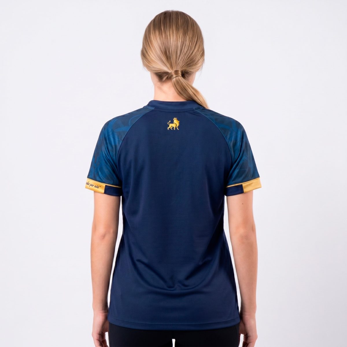 Design Exclusivo: Azul-marinho com detalhes dourados e mangas texturizadas.